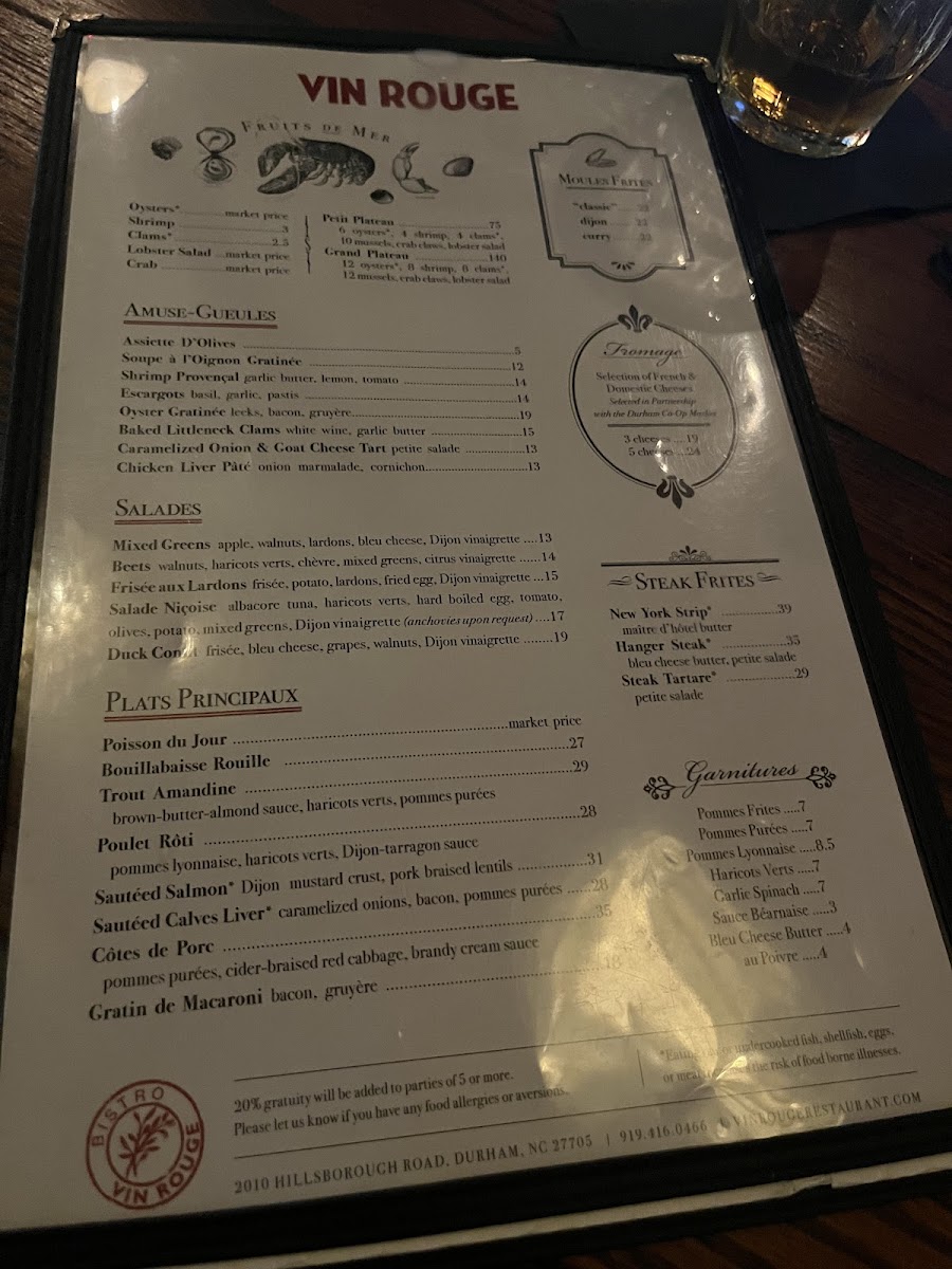 Welcome to Vin Rouge, a charming bistro located at 2010 Hillsborough Rd, Durham, NC. This culinary gem invites you to indulge in exquisite French-inspired dishes that promise to delight your palate.